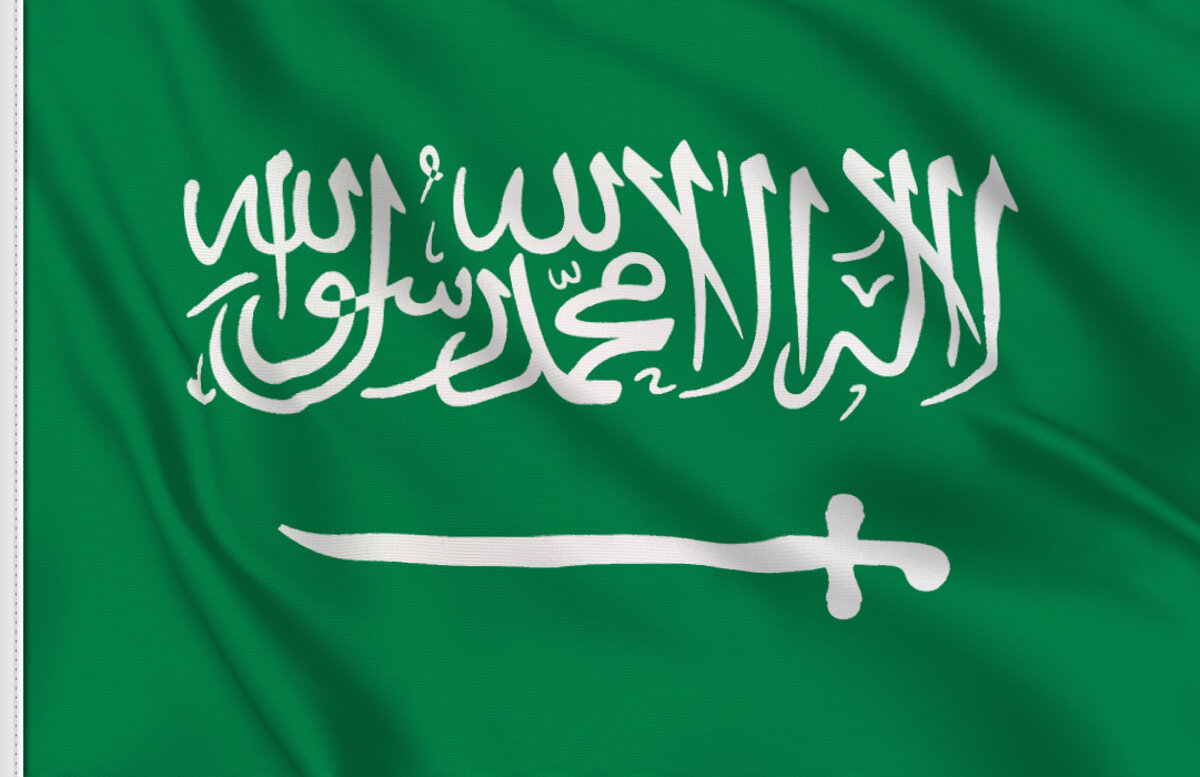 Bandera de arabia saudita disponible en tejido poliéster 100%, microperforado, de varias medidas desde 015×020 cm a 150×300 cm y de alta calidad. No hay más dios que alá y mahoma es su profeta y una espada. La espada fue agregada en 1906.