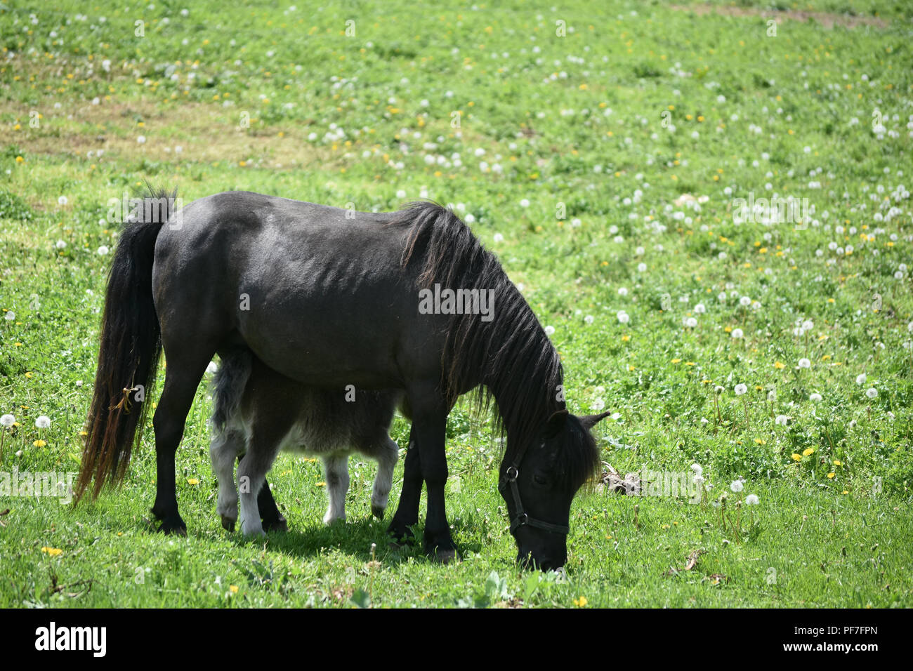 Background. Un cavallo in miniatura che porta il nome della famiglia falabella. Cavallino nato da pochi giorni succhia il latte da mamma cavalla.